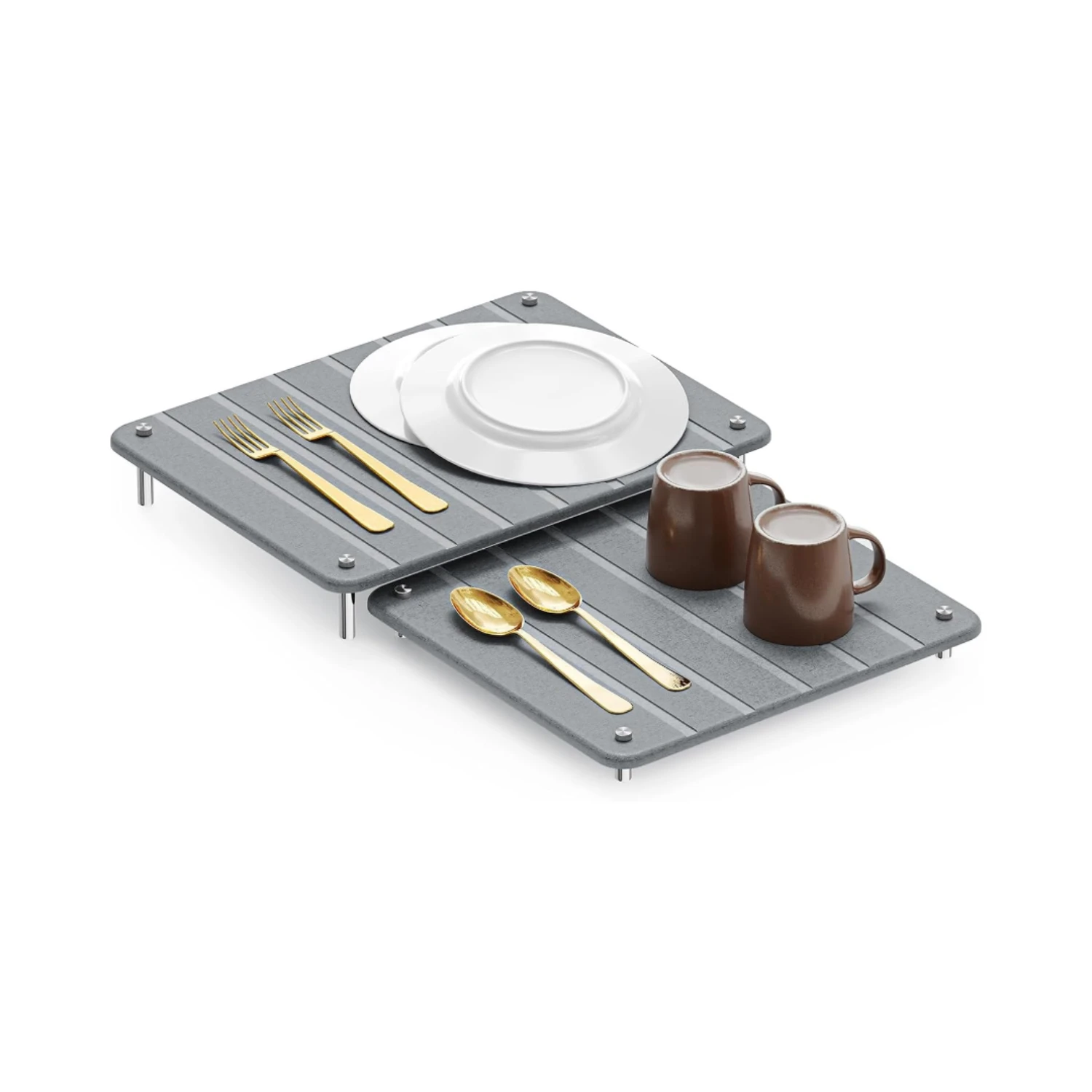 2 Sizes for Versatile Use: Includes a high shelf (15.8″L x 11.8″W x 2.4″H) and a low shelf (13″L x 11.8″W x 1.3″H), designed to fit different kitchen countertop spaces.