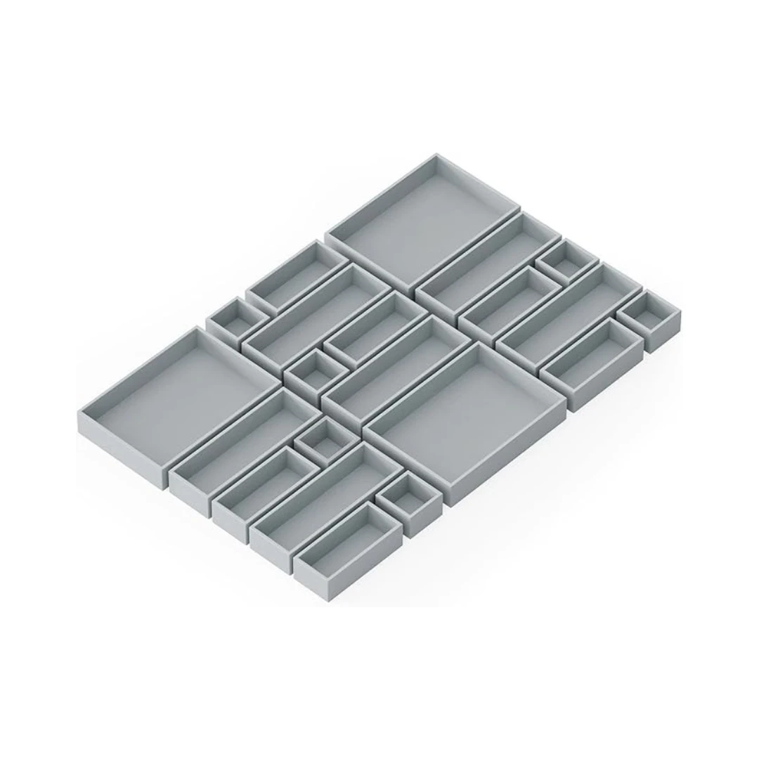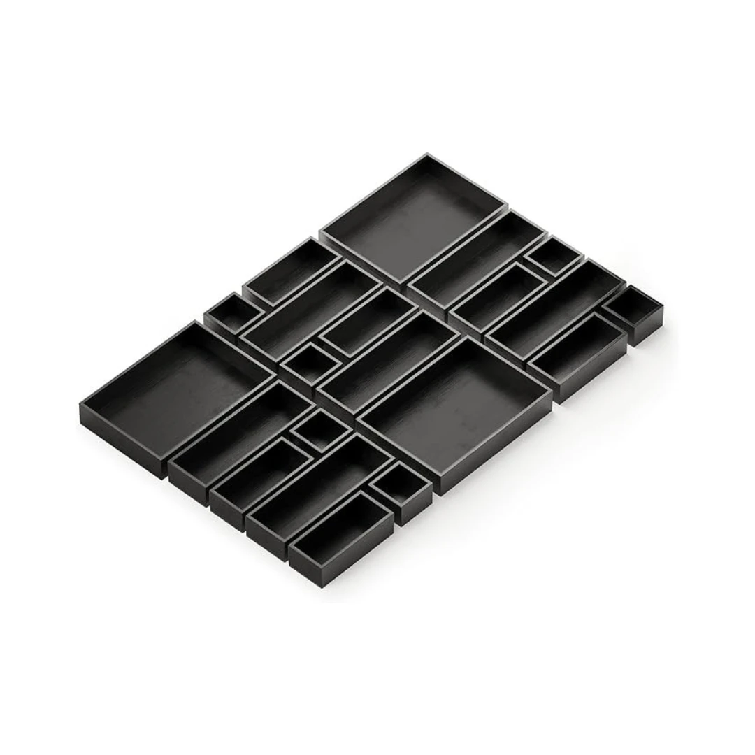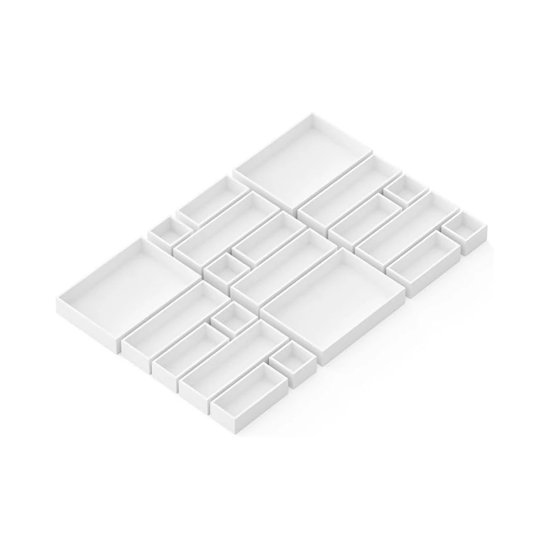 Keep your drawers neat and organized with these 21 white bamboo drawer organizer boxes. The set includes various sizes: Mini (3″W x 3″D x 1.9″H), Small (3″W x 6.8″D x 1.9″H), Medium (3.5″W x 10.5″D x 1.9″H), and Large (7.7″W x 11″D x 1.9″H) to suit different drawer sizes.