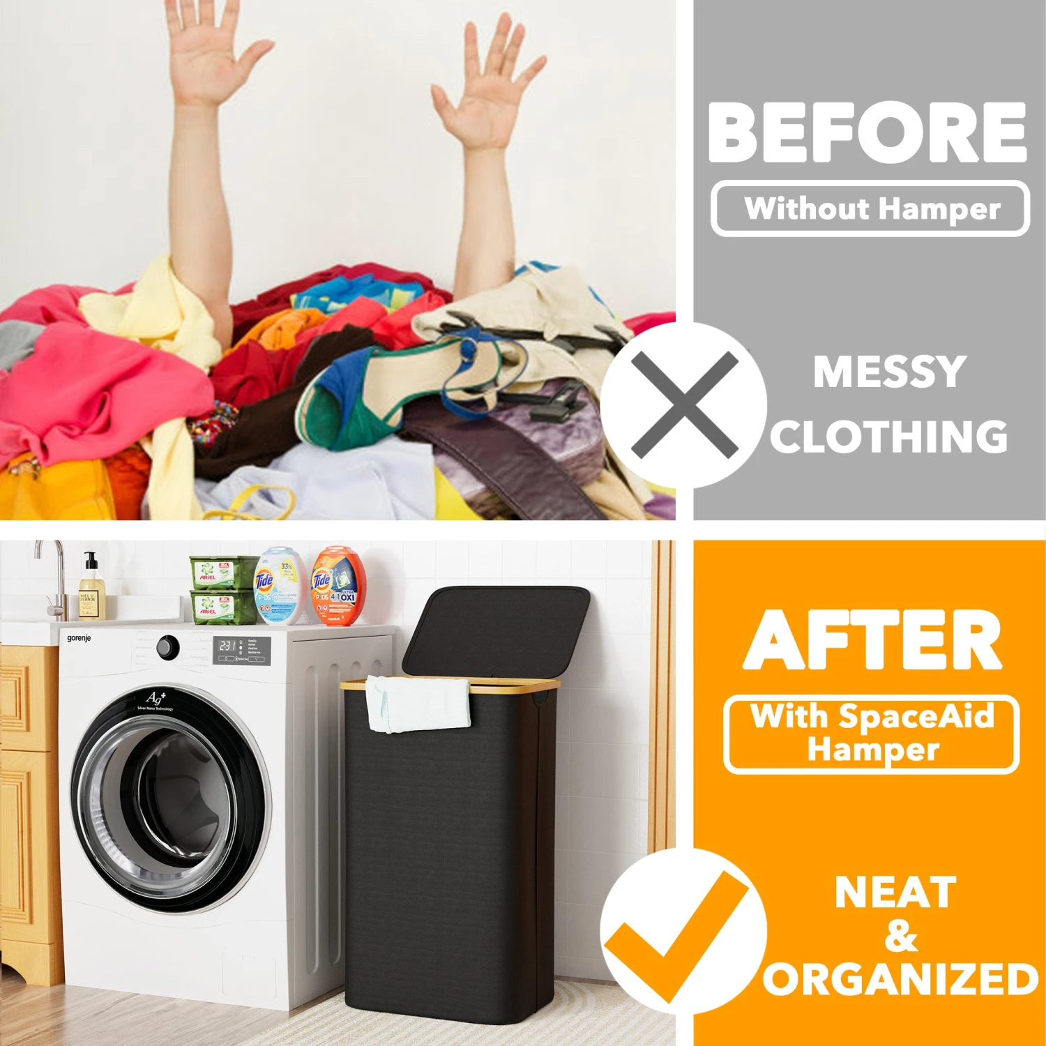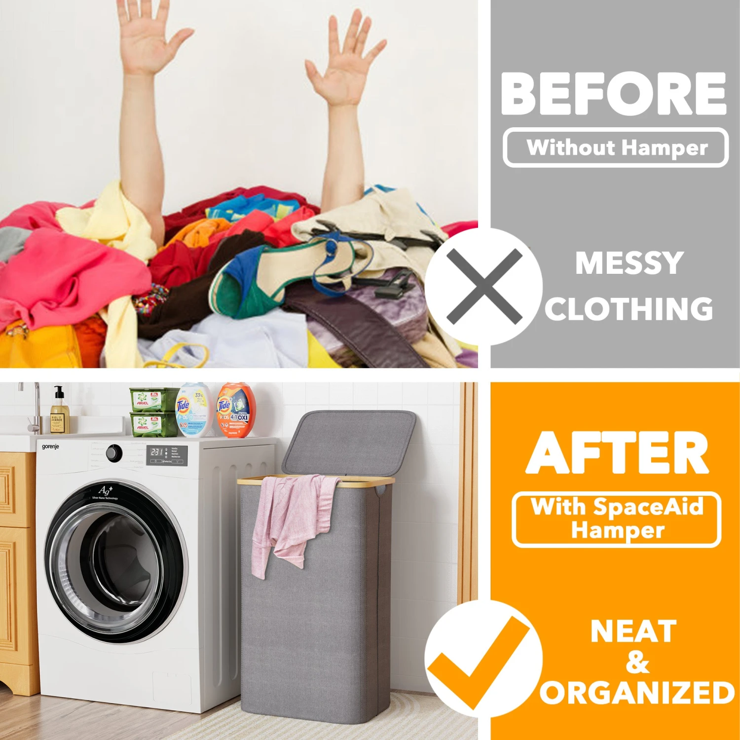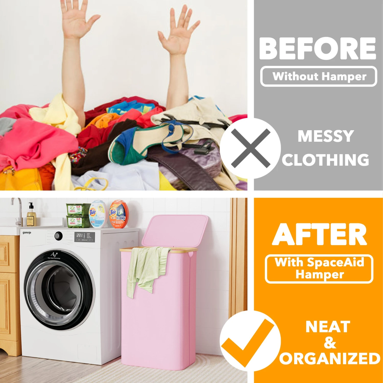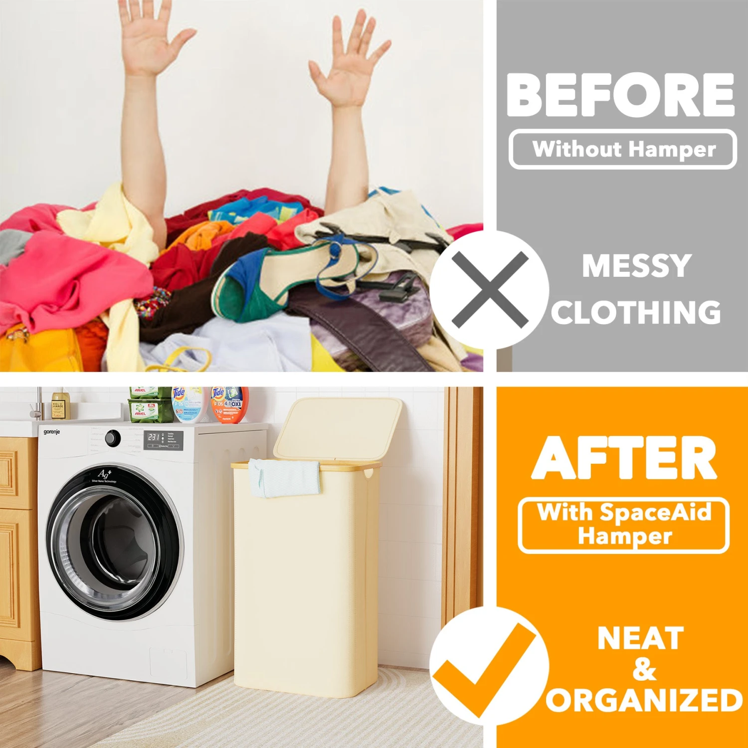 Made from natural bamboo material and thick cationic cloth, the laundry hamper is both durable and smooth to handle. Its bamboo handle is designed for easy carrying, even for pregnant women, seniors, and kids, making it convenient to move up and down stairs.