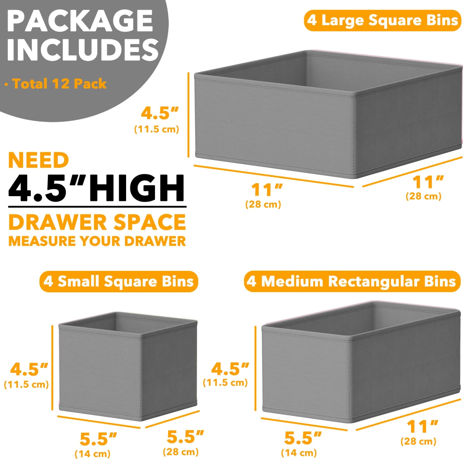 4 large square bins (11″x11″x4.5″), 4 medium rectangular bins (11″x5.5″x4.5″), and 4 small square bins (5.5″x5.5″x4.5″). These versatile sizes make them perfect as a dresser drawer organizer.