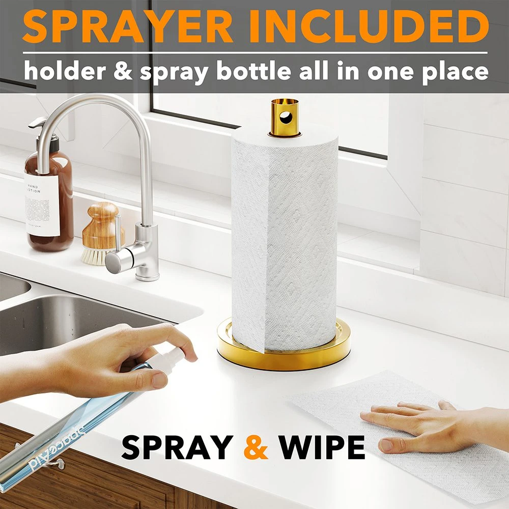 - Multifunctional Design: This 2-in-1 gold paper towel holder features a black stand with an integrated spray bottle in the center, ensuring a neat and organized kitchen countertop.
