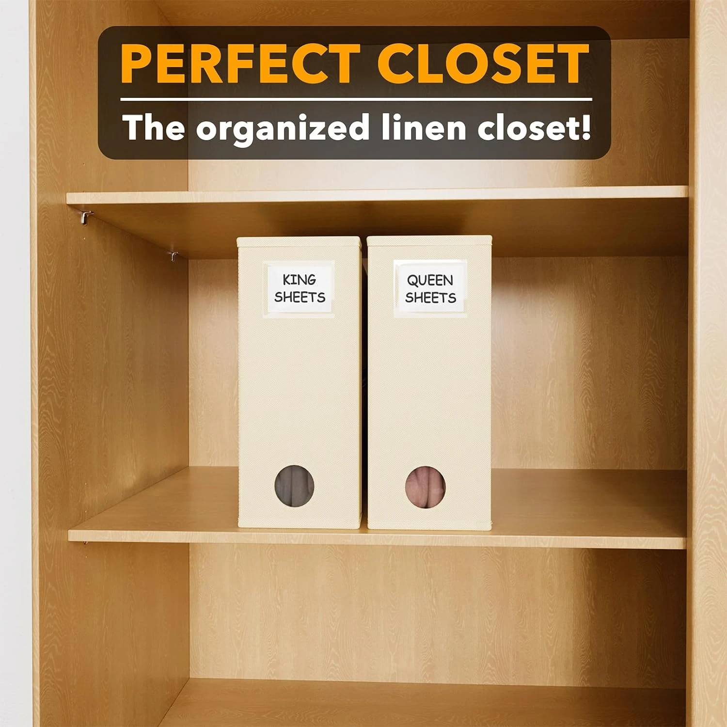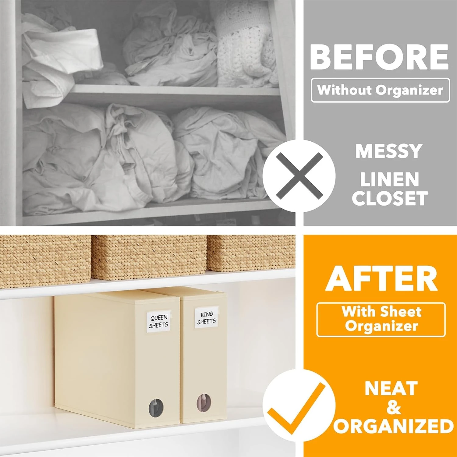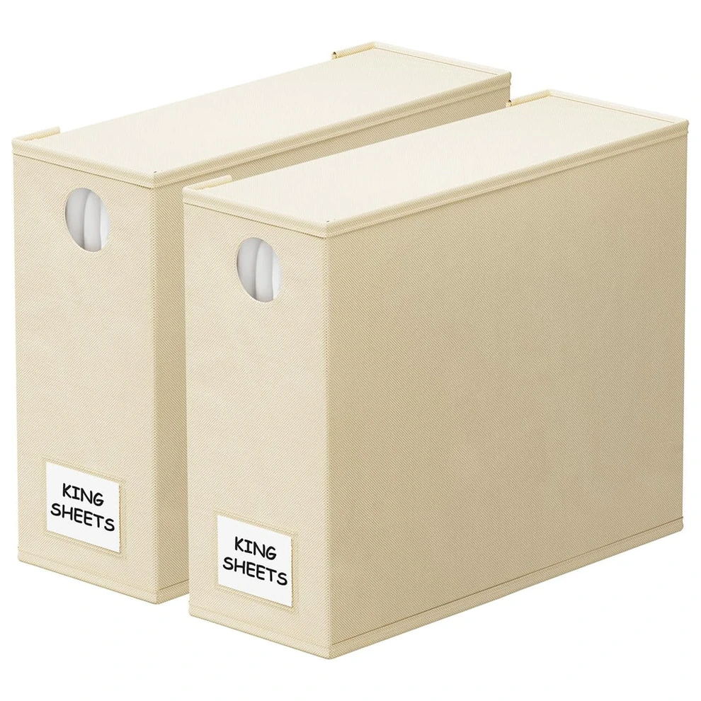 - 2 PACK OF BEIGE SHEET ORGANIZERS – Enhance the organization and aesthetics of your linen closet with these convenient foldable fabric organizers for bed sheets. Each bed sheet storage organizer measures 5″W x 15″D x 12.8″H.