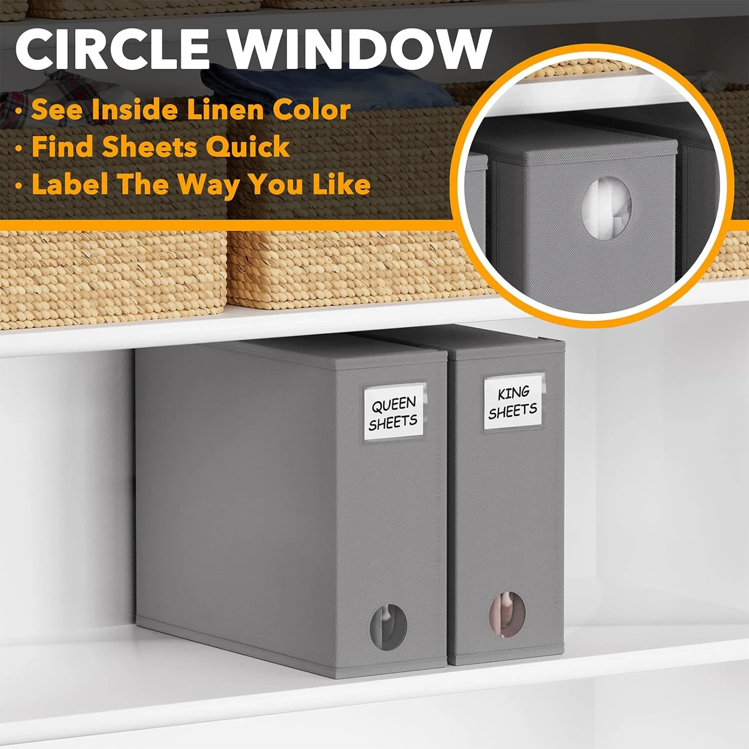 - CIRCLE WINDOW DESIGN – Featuring a circle window design, the foldable sheet organizer allows you to easily see the color of the linens stored inside. Their modern and beautiful appearance makes them suitable for any home style.