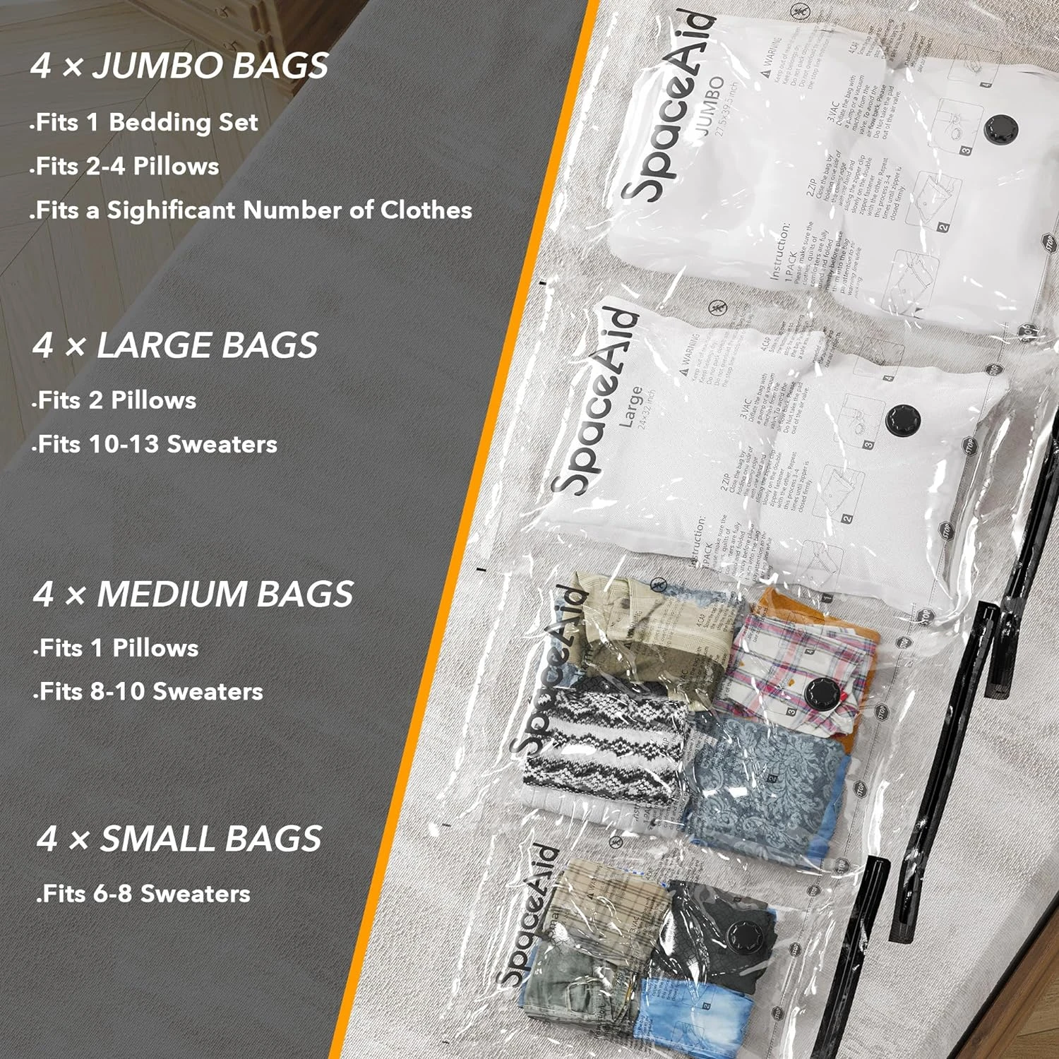 - 20 Pack Includes: 4 Jumbo: 31.5” X 39.5”, 4 Large: 24” X 32”, 4 Medium: 20” X 28”, 4 Small: 16” X 24”, 4 Travel Roll Up (No need vacuum): 16” X 24”.