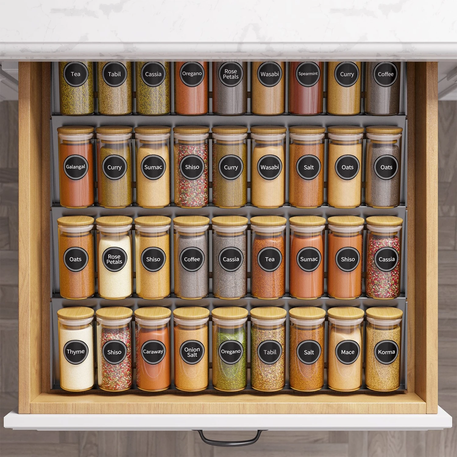 SpaceAid Spice Organizer For Drawer With 36 Spice Jars, 386 Spice Labels And Chalk Marker, 4 Tier
