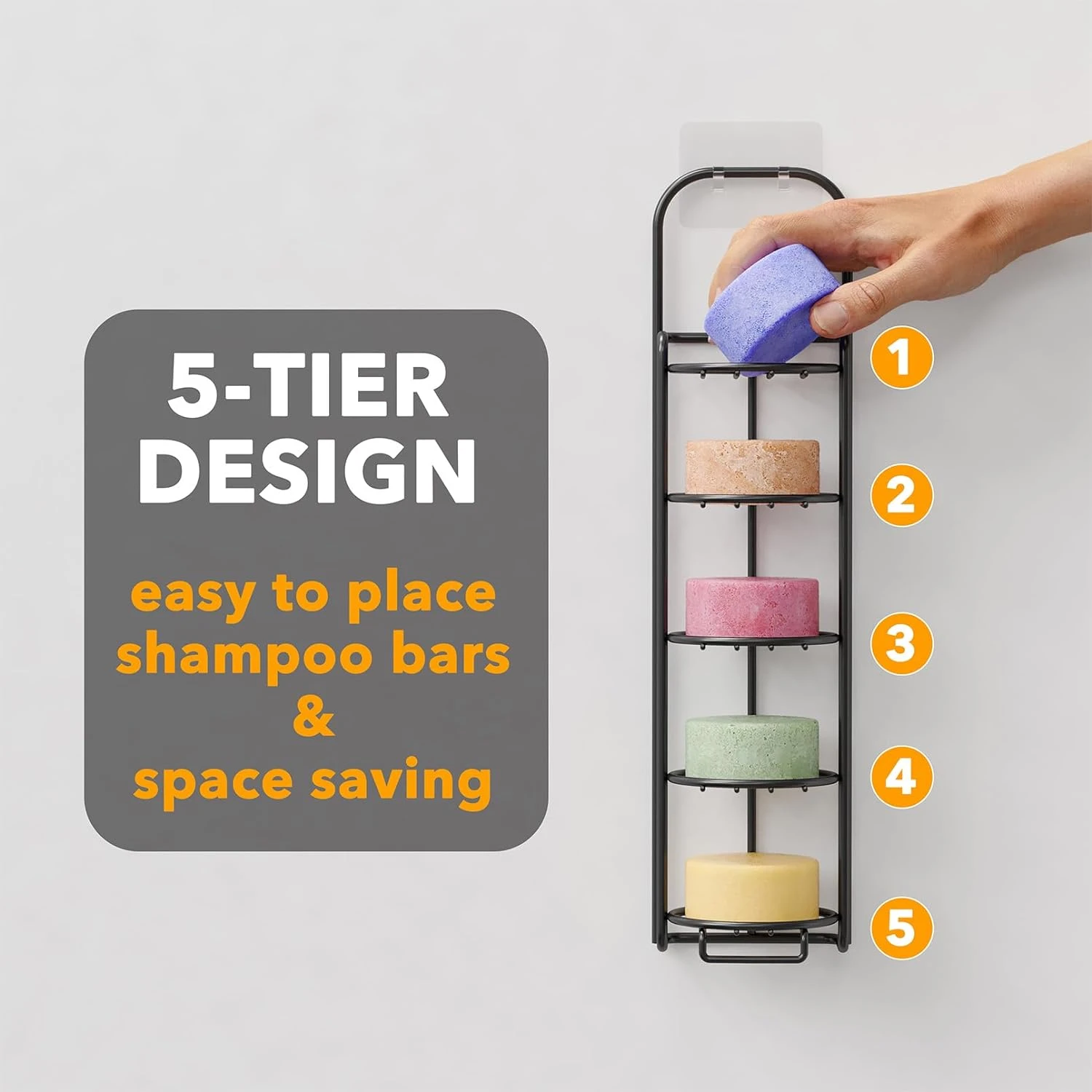 - 5-TIER ORGANIZED AND BEAUTIFUL – Keep your shower room neat and organized with the soap holder for shower. This soap organizer is specifically designed for storing and organizing your shampoo bars. Size: 4.5″L x 4″W x 17″H.