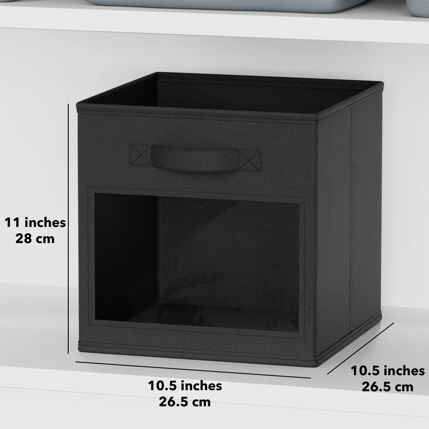 Measuring 10.5″L x 10.5″W x 11″H, these fabric storage cubes are designed to fit perfectly into cube storage organizers with openings of 11 inches or larger.
