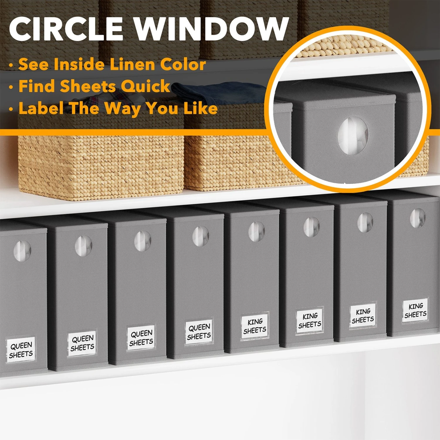 - Clear Circle Window Design: The front circle window allows for easy identification of linen colors without the need to open each organizer. This beautiful and modern sheet organizer container seamlessly complements any home style.
