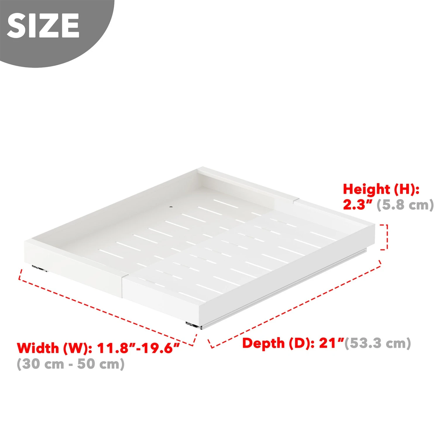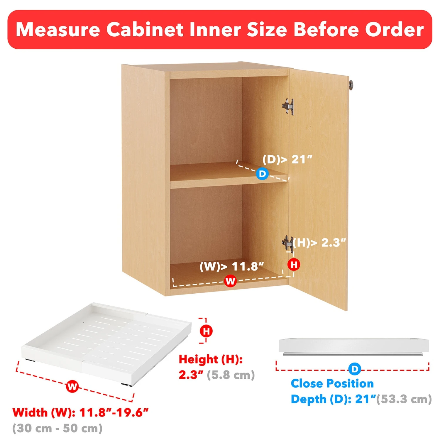 Versatile width adjustment: Our pull-out shelves for cabinets extend from 11.8″ to 19.6″, accommodating different kitchen cabinets. Dimensions: 21″D x (11.8-19.6″)W x 2.3″H.
