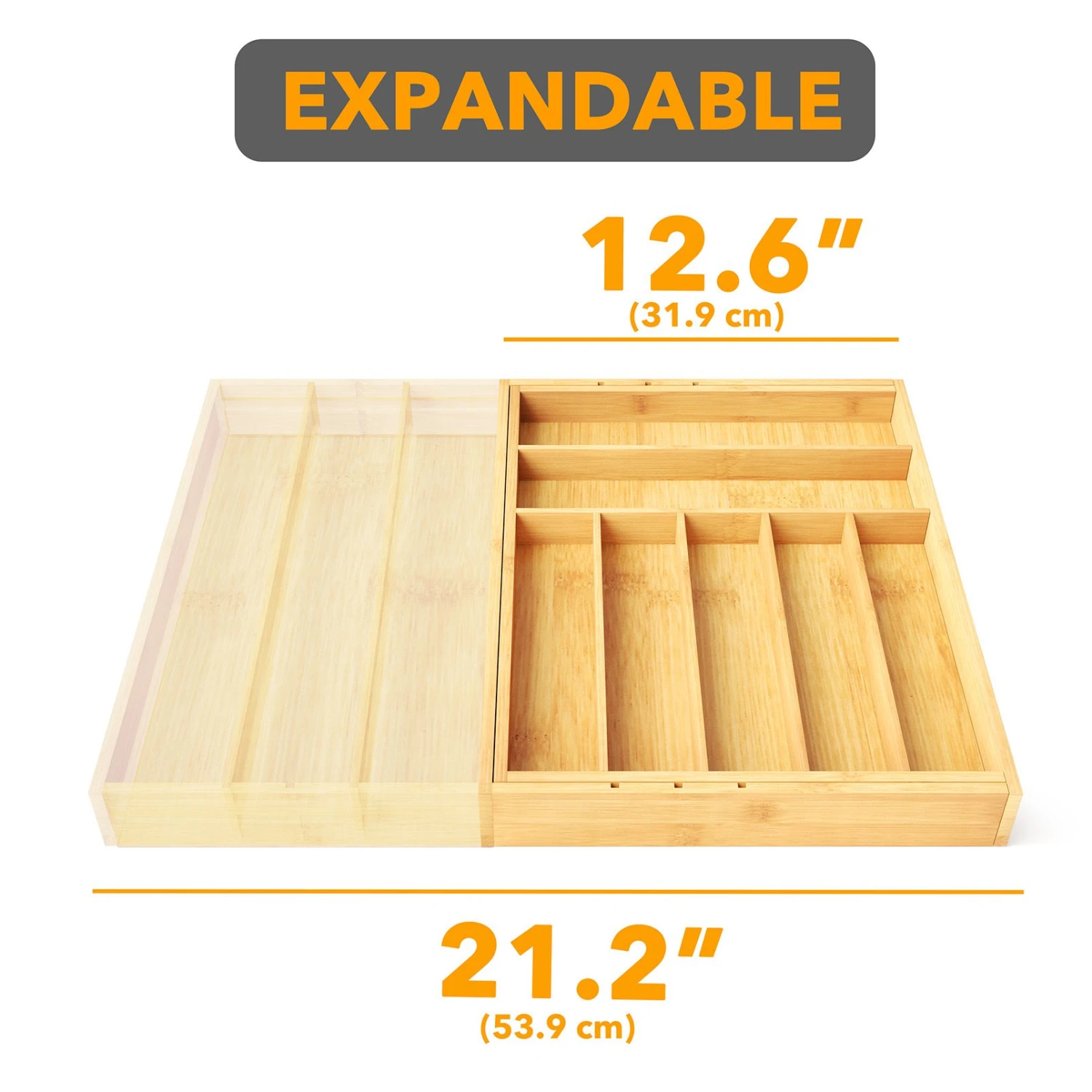 - ORGANIZED AND BEAUTIFUL – Make your kitchen drawer neat and organized with bamboo expandable silverware organizer. The utensil organizer is designed for your different silverware kitchen storage organization; SIZE: 16.9″L x 12.6″-21.2″W x 2″H