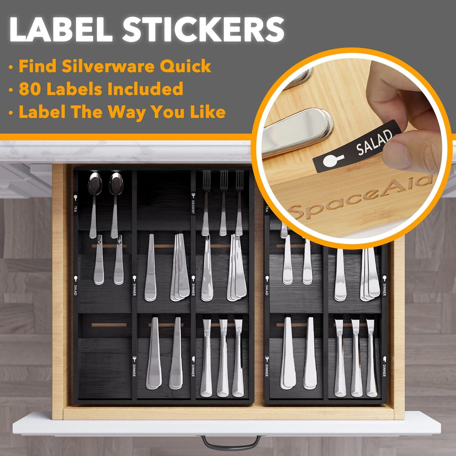- Easy Identification: Included with the organizer are 80 label stickers that allow you to quickly identify the contents of each compartment. You have the choice to label the bamboo kitchen organizer for clear organization or keep the clean look of the silverware holder by not using the labels.