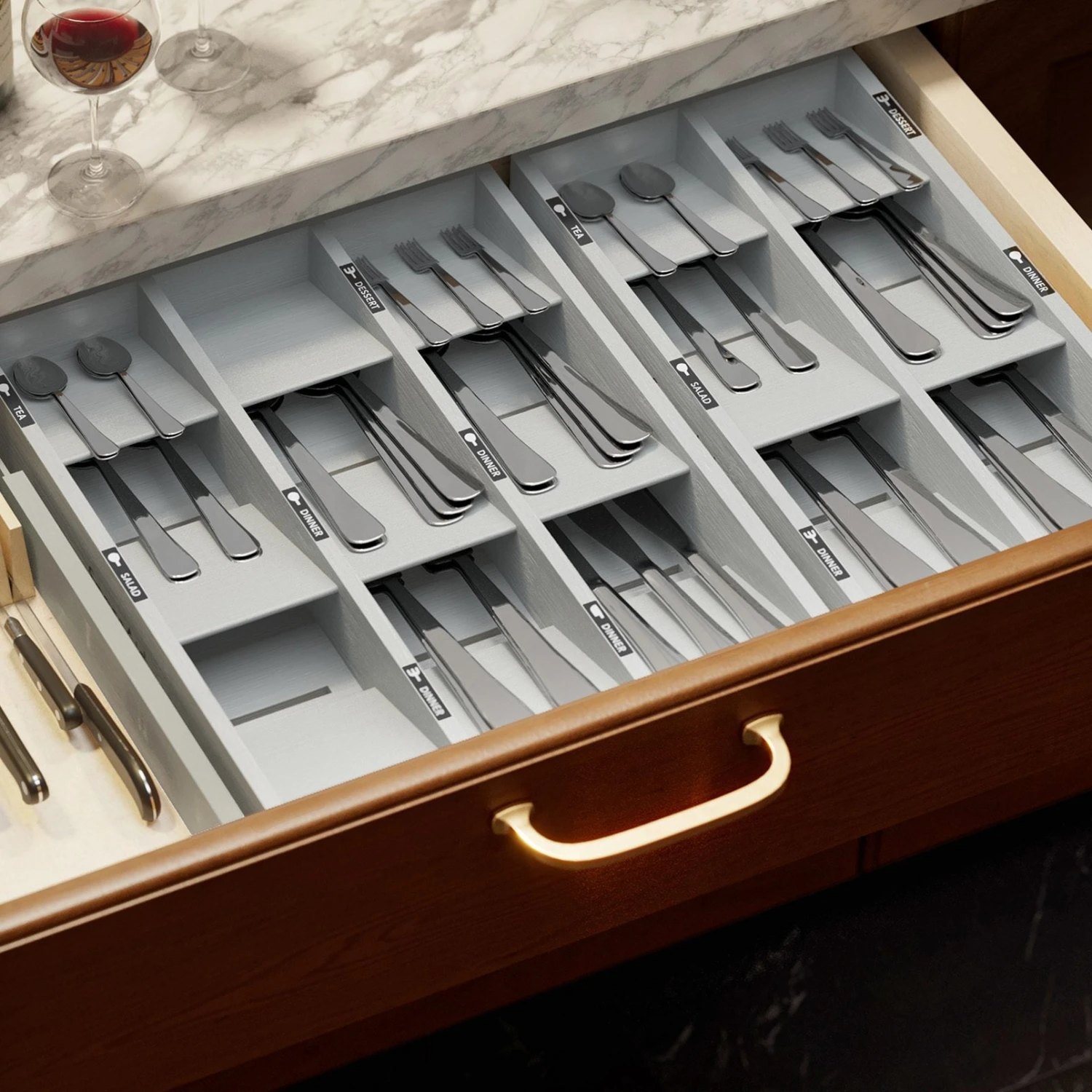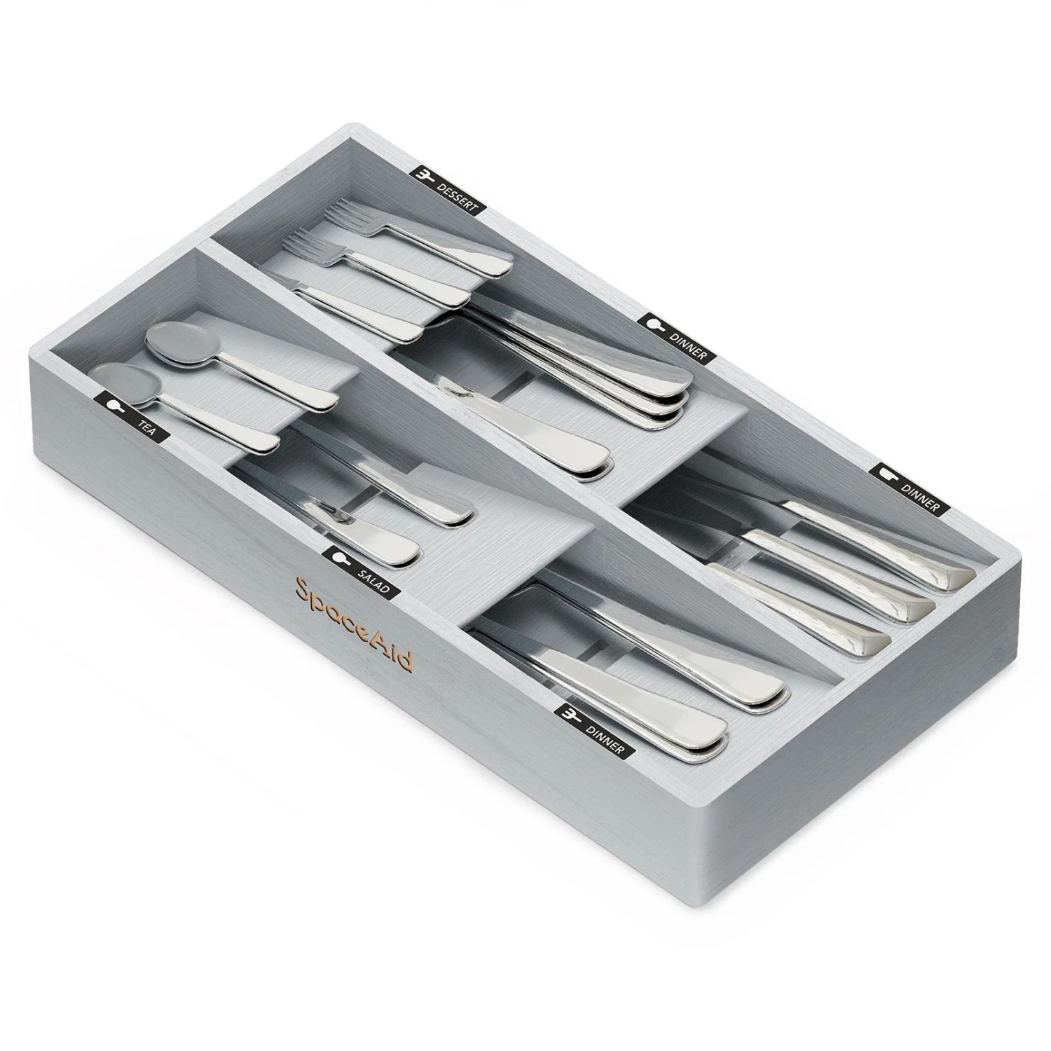 - Neat and Elegant: Transform your kitchen drawer into a perfectly organized and visually appealing space with the gray bamboo silverware organizer. This utensil organizer is designed to provide efficient storage and organization for various types of silverware, utensils, flatware, cutlery, spoons, and knives.