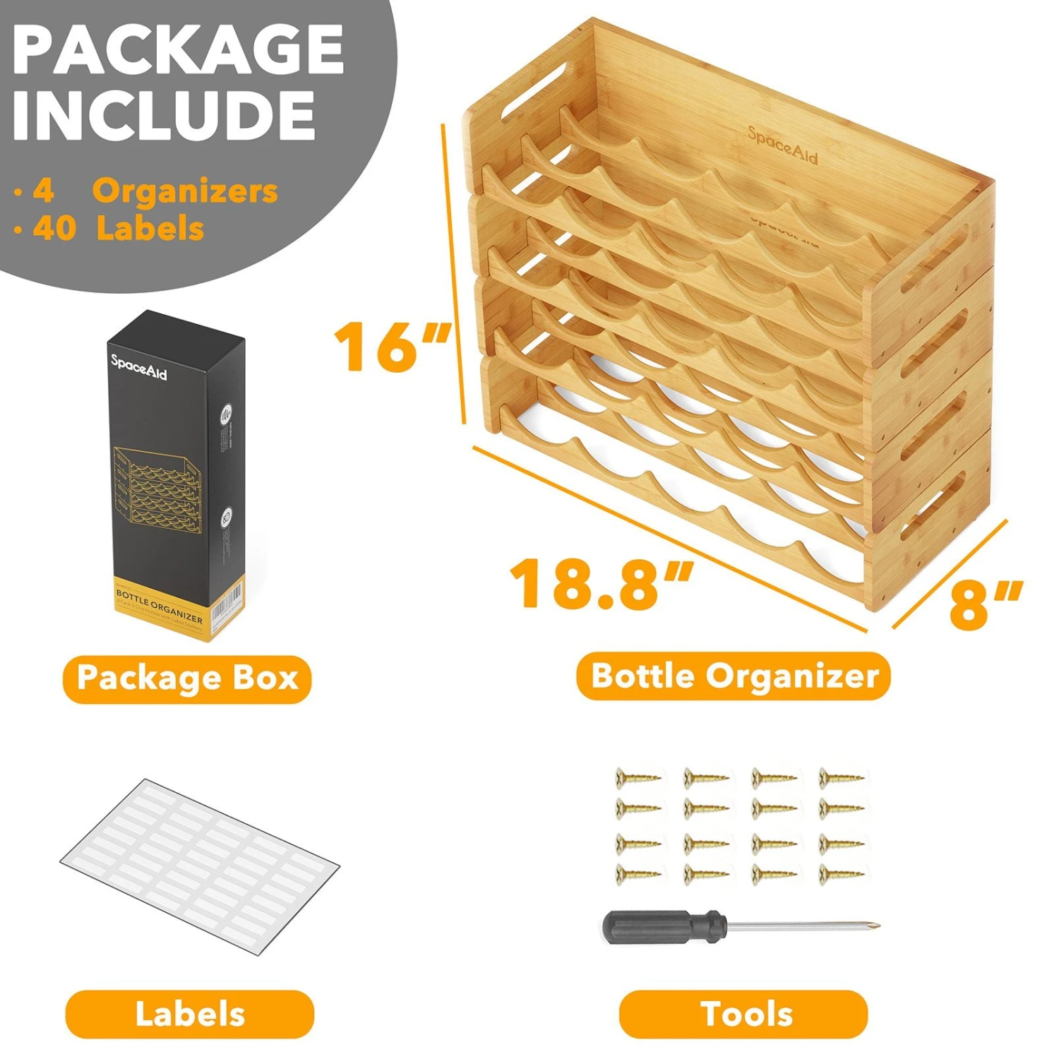 - Blank Labels Included: The stackable water bottle organizer comes with blank labels that can be placed on the front of each compartment. These labels allow you to quickly identify the contents of each bin, facilitating easy organization and retrieval of your bottles. You can write and label the bamboo holder clearly or maintain a clean look by not using the labels.