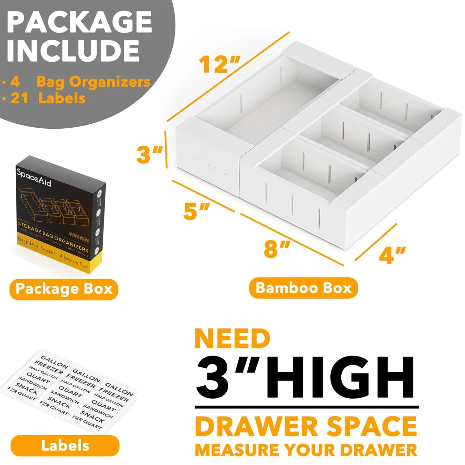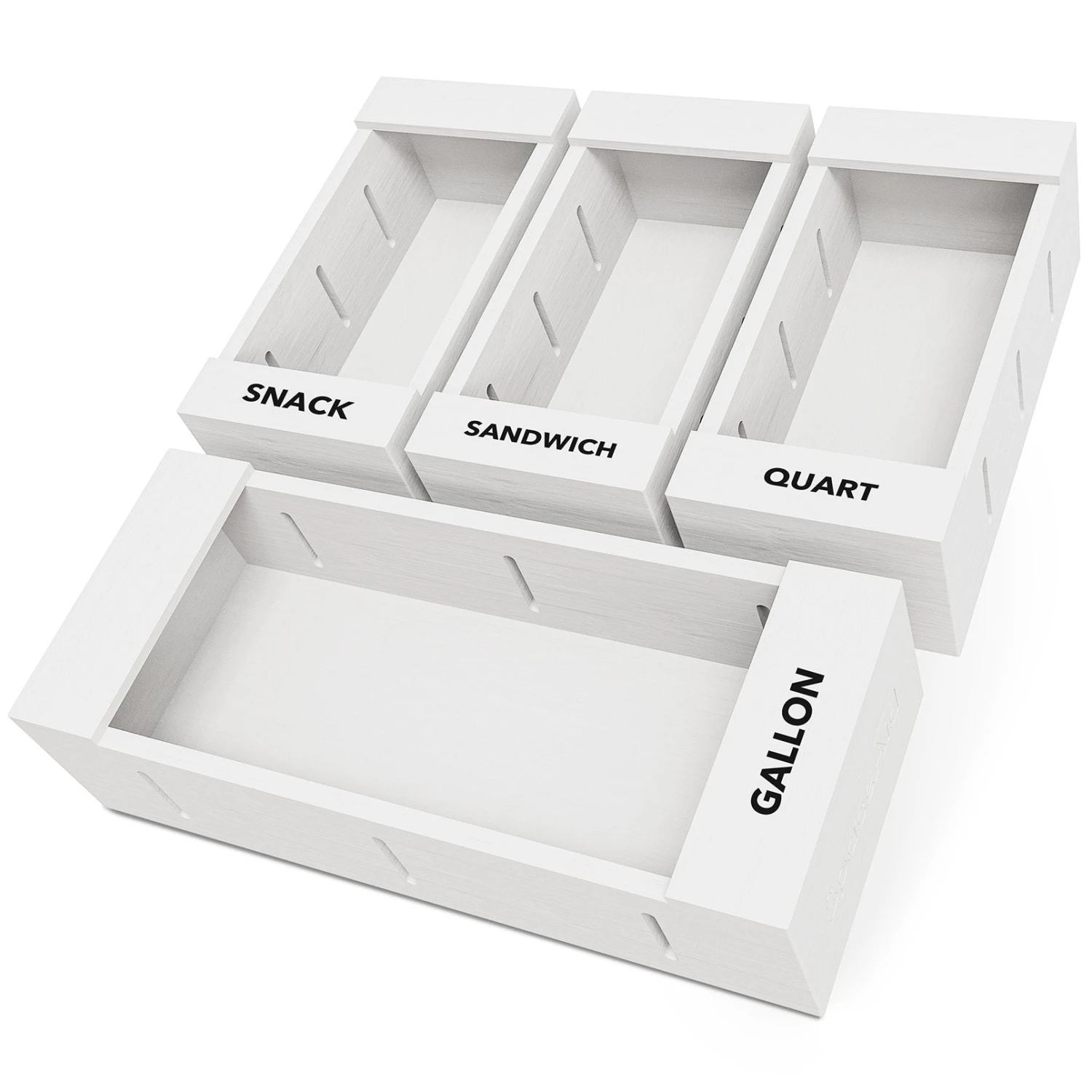 - No Assembly Required: Our white bamboo organizer box comes fully assembled and is easy to use. The dimensions are 12 x 5 x 3 inches (1 pc) for gallon-sized bags and 8 x 4 x 3 inches (3 pcs) for sandwich, quart, and snack-sized bags.