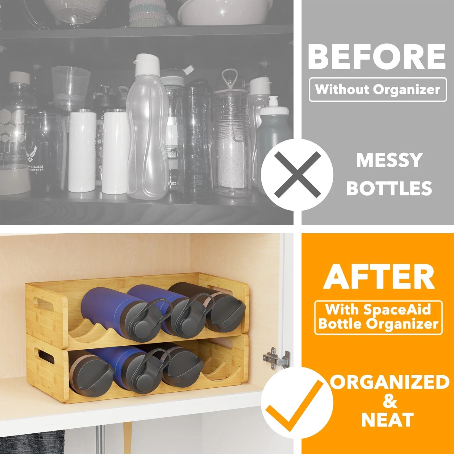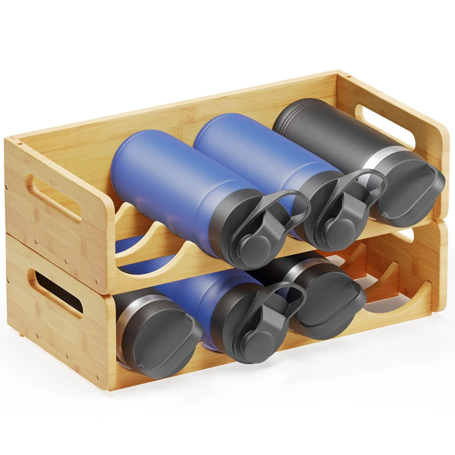 - Say goodbye to the hassle of cramming water bottles into cramped cabinet spaces. This bamboo water bottle organizer rack ensures an ideal storage solution, keeping your home clean and allowing you to easily keep track of your water bottles.