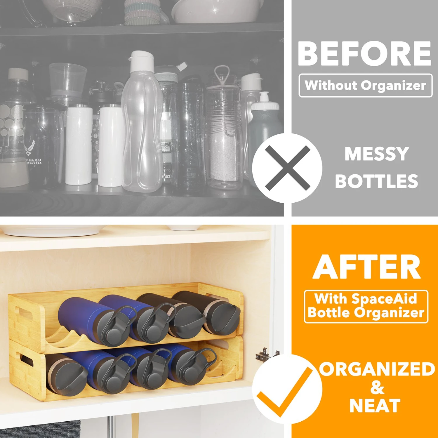 - Keep your kitchen cabinet organized and aesthetically pleasing with our bamboo water bottle storage organizer. Designed specifically for organizing different sizes of bottles, each bin measures 18.8″W x 8″D x 4″H.