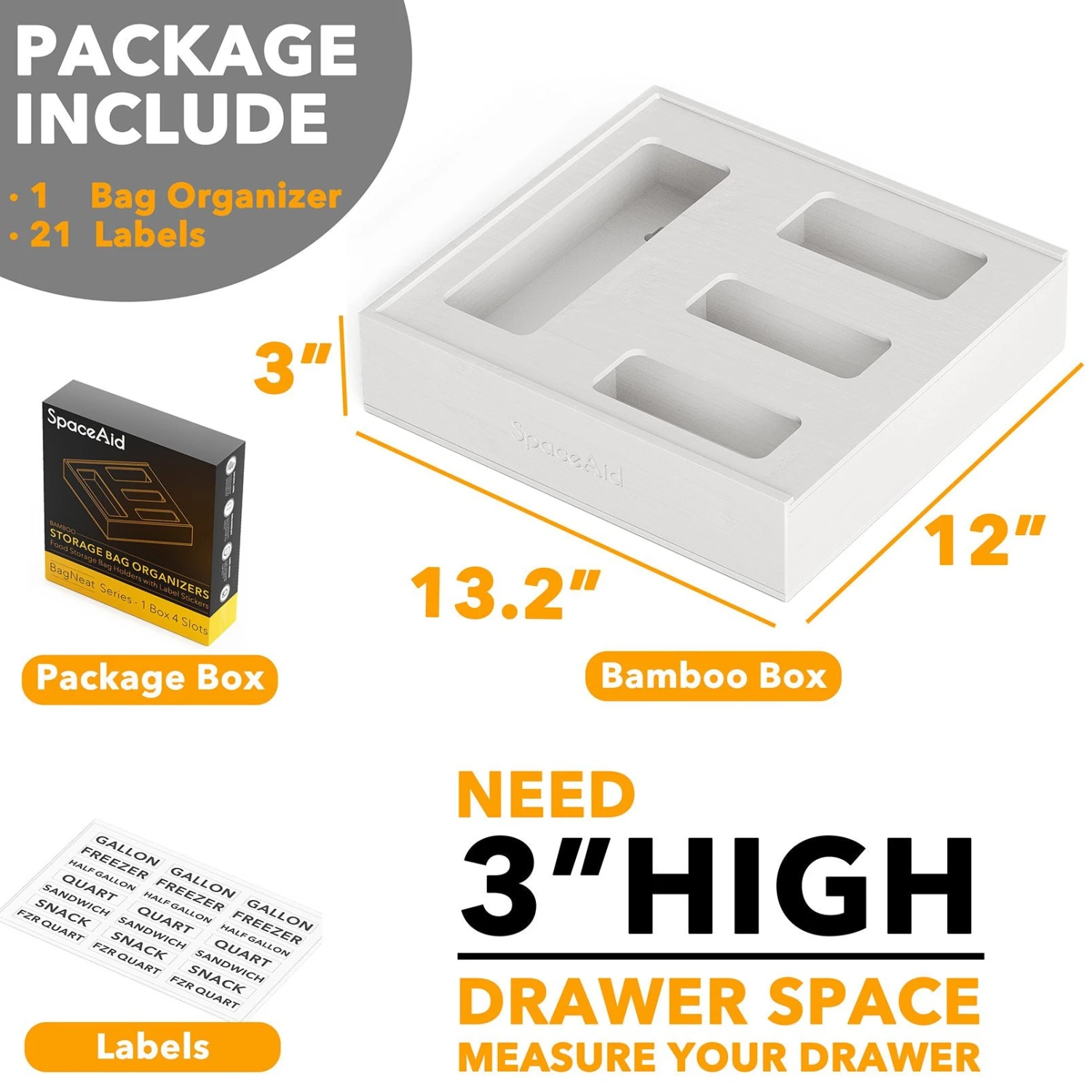 - Bamboo Ziplock Bag Storage Organizer – Keep your drawer tidy and well-organized using this bamboo box. Specifically designed for organizing your food storage bags, its dimensions are 13.2″ L x 12″ W x 3″ H.