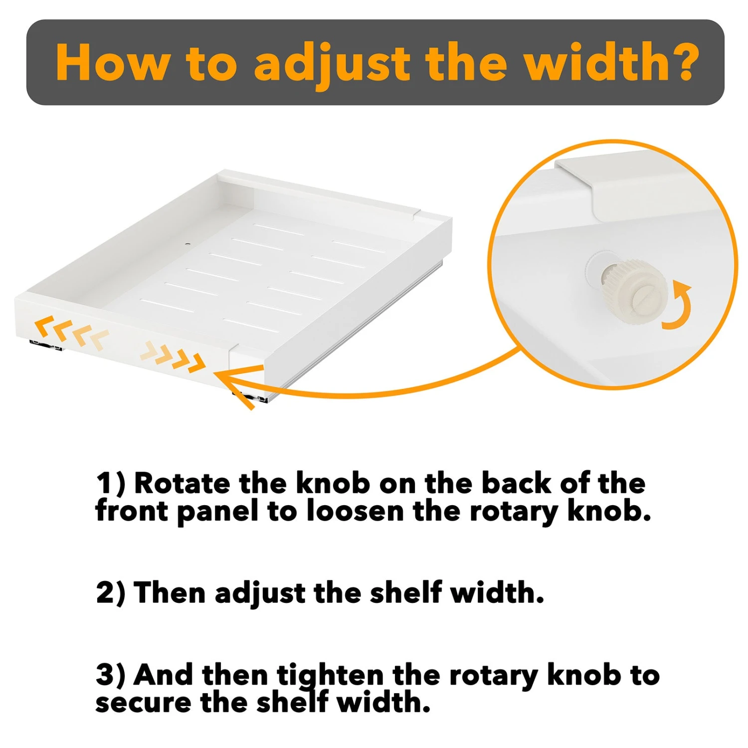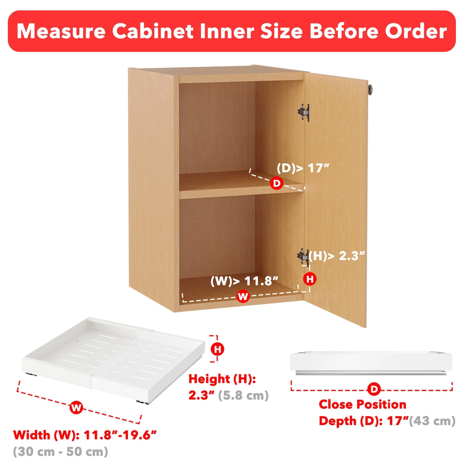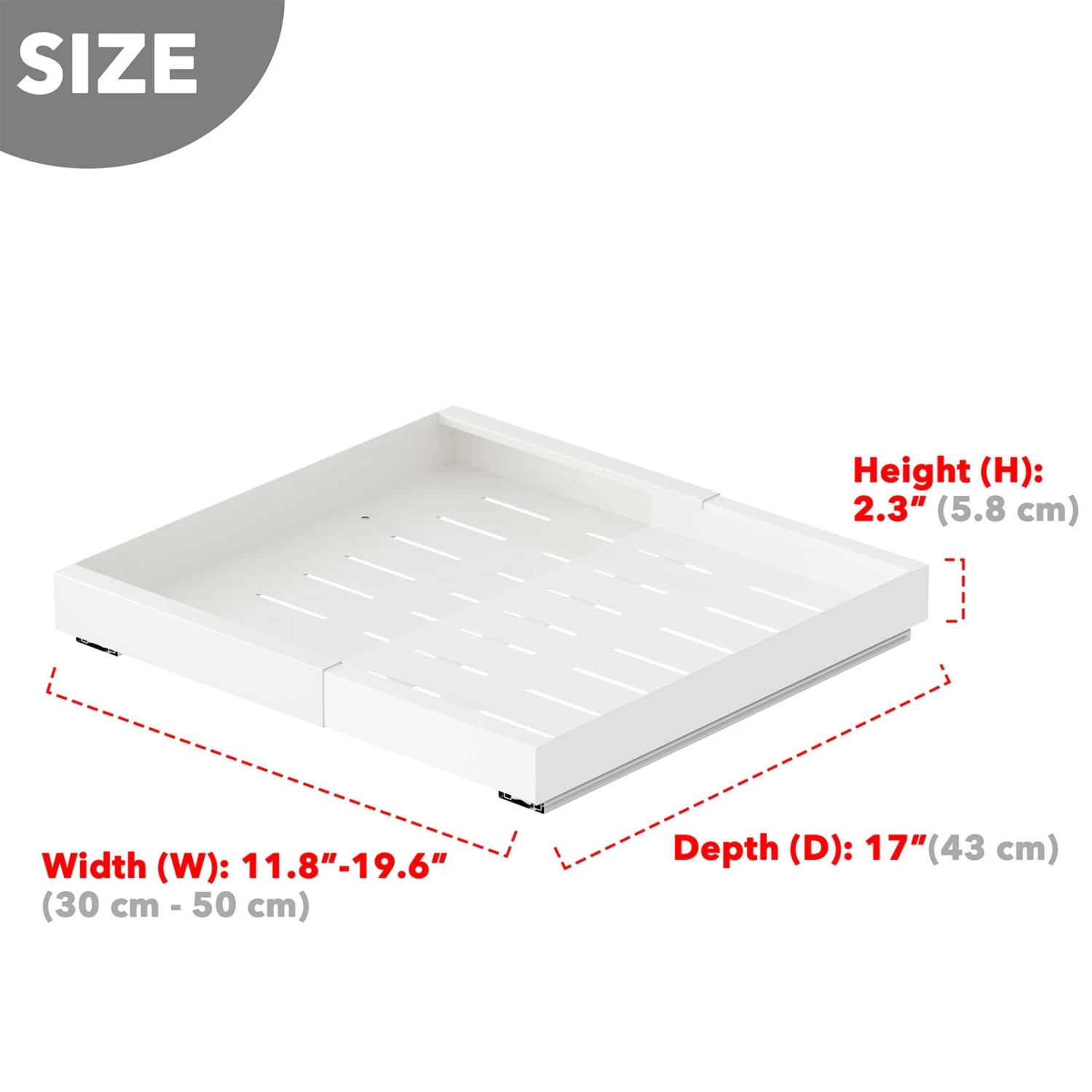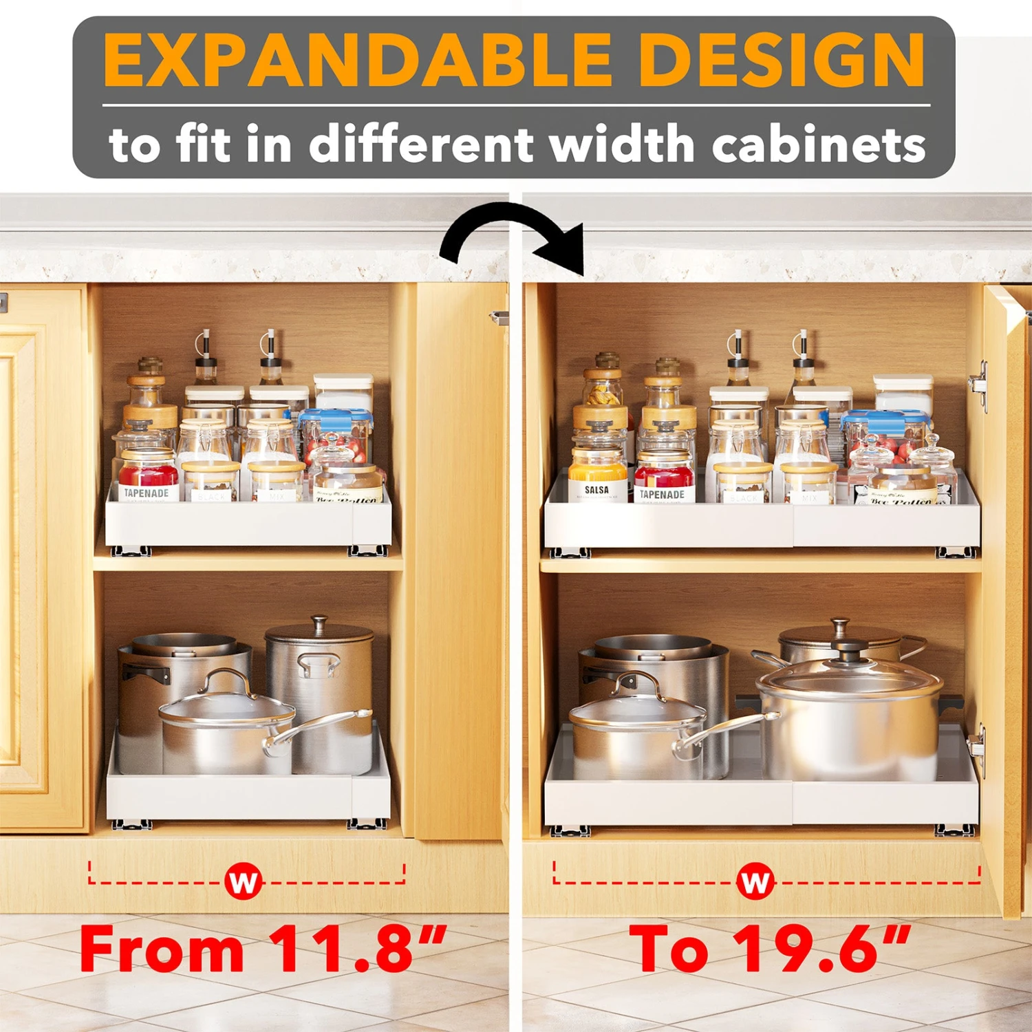 WIDTH EXPANDABLE RACK – This adjustable pull-out cabinet organizer features a width that can be extended. The no-drill drawer adjusts from 11.8″ to 19.6″ in width. Tailor the peel-and-stick drawers to fit a variety of kitchen cabinets. DIMENSIONS: 17″D x (11.8-19.6″)W x 2.3″H.