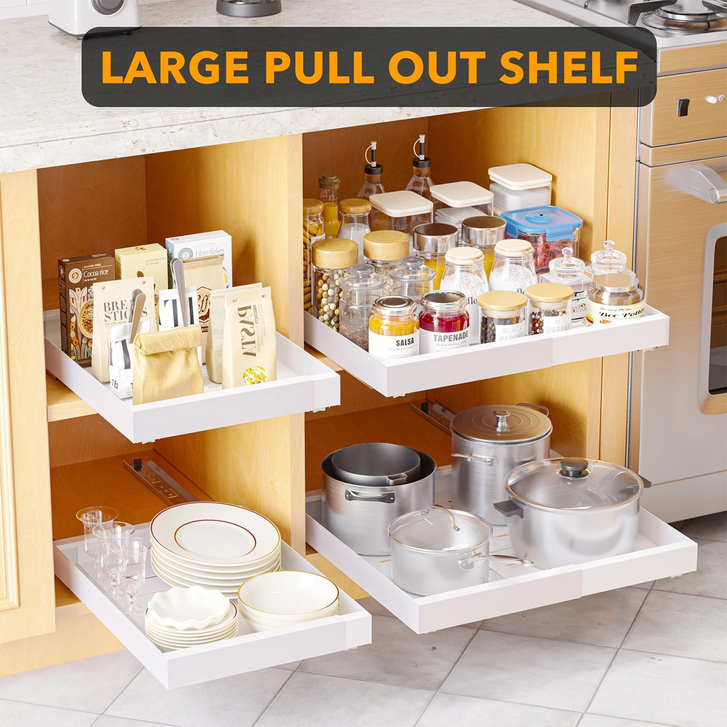 DURABLE MATERIAL TO LAST – Constructed from top-quality steel, this pull-out cabinet organizer is designed for long-lasting use. Our space-saving shelf drawers enhance your home storage system and maximize cabinet space efficiency.