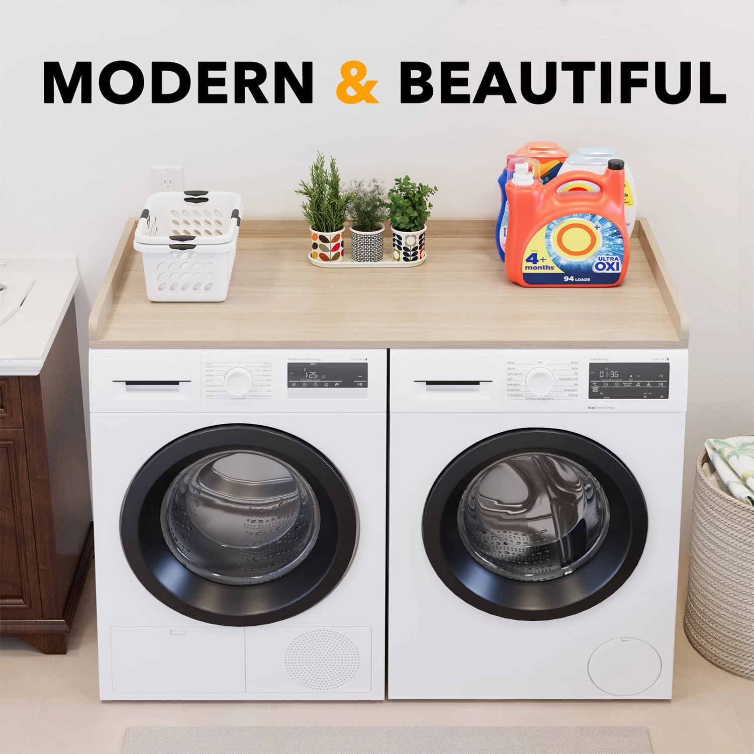 - STURDY CONSTRUCTION – Made of durable solid board which is easy to clean; Sturdy enough to hold lots of laundry hamper room accessories; Live an organized life with this laundry countertop