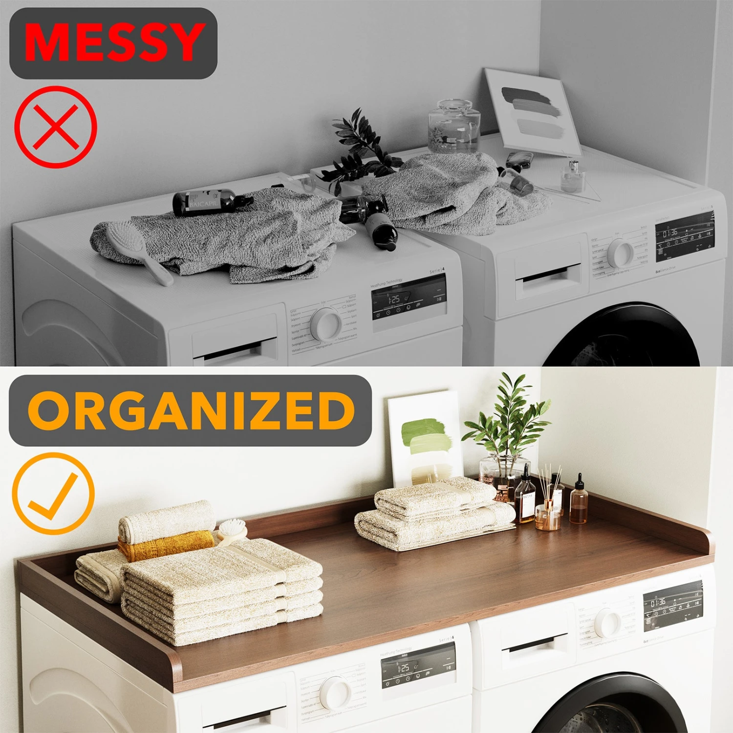 - BEAUTIFUL COUNTERTOP- Keep your washer and dryer top space organized with this shelf over washer and dryer; Make your laundry room storage functional by the spacious cover holder; Color Brown Wood; SIZE: 54″W x 27.5″D x 2.7″H