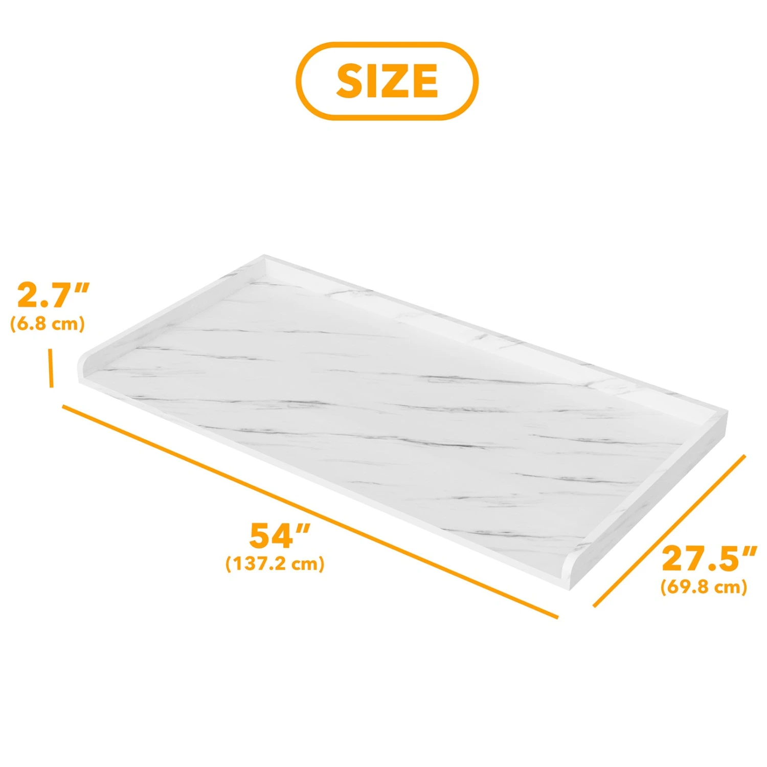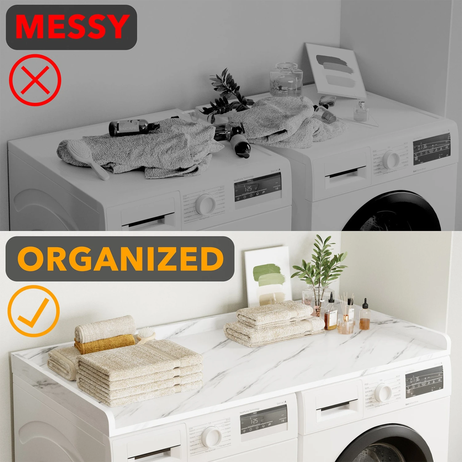 - BEAUTIFUL COUNTERTOP- Keep your washer and dryer top space organized with this washer and dryer shelf; Make your laundry room storage functional by the spacious cover holder; Color White Marble; SIZE: 54″W x 27.5″D x 2.7″H