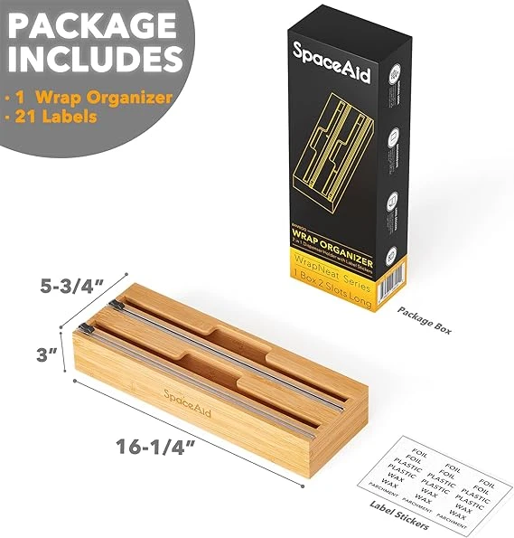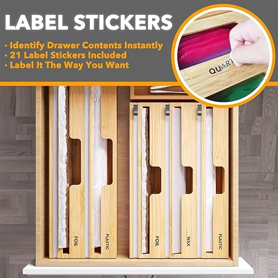 - Label Stickers Included: The plastic wrap and foil organizer package includes 21 label stickers that allow you to easily identify the contents of each slot. You have the option to label the bamboo organizer clearly or keep it label-free for a clean and minimalistic look.